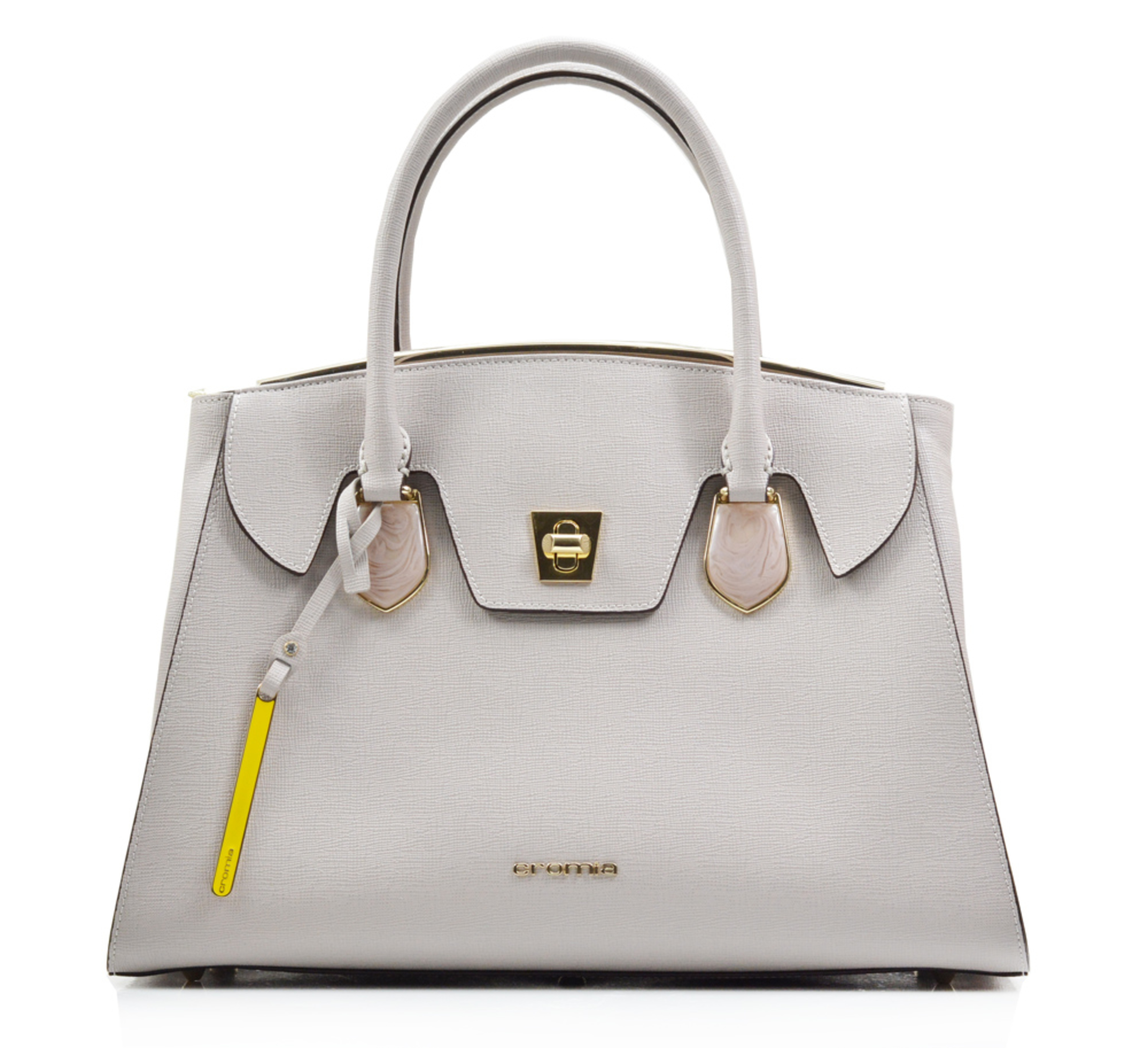 Skórzana torebka marki Cromia w beżowym kolorze z wykończeniami w jasnym złocie. Posiada 2 przegródki zapinane na zamek błyskawiczny z wewnętrzną kieszenią na telefon komórkowy.