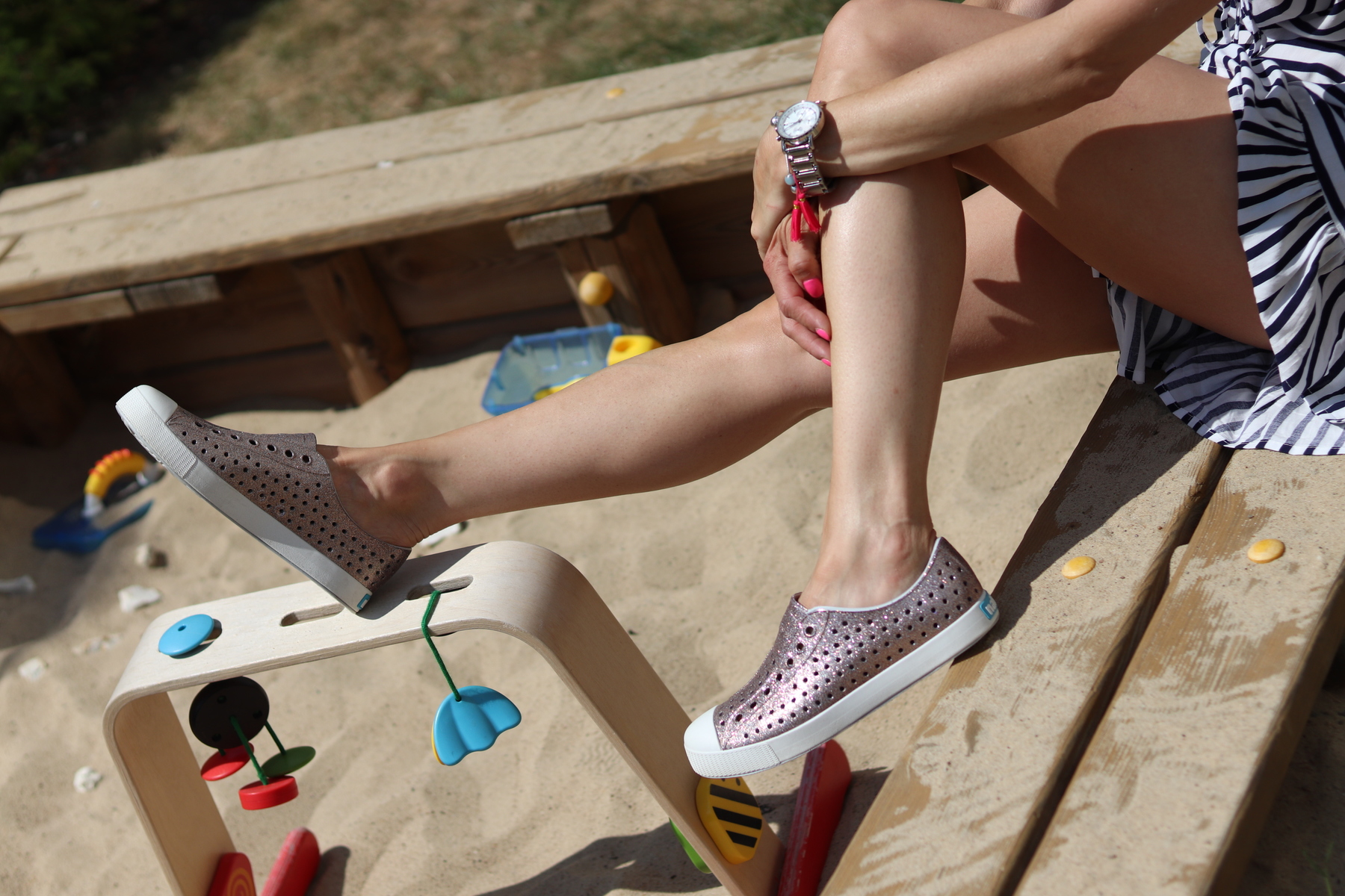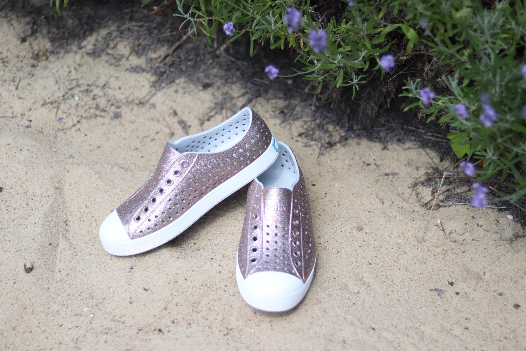 Buty są zmywalne, czyli można je bez trudu wyczyścić. Są wodoodporne, idealnie nadają się do jeziora czy morza, ochronią wrażliwe stopy przed glonami czy koralowcami. Ponadto trampki są bezwonne, hipoalergiczne oraz wegańskie, co znaczy, że przy ich produkcji nie używa się żadnych produktów pochodzenia zwierzęcego. Model o chłodnym, metaliczno-różowym odcieniu z połyskującym w słońcu glitterem.